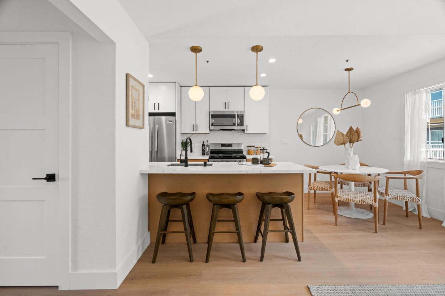 Experience modern living at its finest in this remodeled top-floor 2-bedroom, 1-bathroom condo, where stylish finishes, open spaces, & breathtaking city views come together to create the perfect home. The open-concept kitchen flows seamlessly into the living room, filled w/ abundant natural light & designed for both relaxation & entertaining, while the newly built private deck offers a great spot for morning coffee or evening wind-downs. Both spacious bedrooms features windows that bring in plenty of natural light & capture expansive city views, offering a serene retreat day or night. The upgraded bathroom includes double sinks, an expansive countertop & generous cabinetry, blending style & functionality. A dedicated laundry closet w/ hookups is ready for your washer/dryer, adding convenience & flexibility. Additional highlights include one garage parking space plus one uncovered spot & a dedicated storage room. The community has recently undergone major renovations, including updated exterior balconies & fresh exterior painting, ensuring lasting curb appeal & peace of mind. Ideally located, this home is close to shopping centers, restaurants, coffee shops & parks, w/ easy access to major freeways, BART & Caltrain, all while being centrally positioned between SF & Silicon Valley.